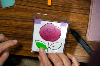 デザインに合わせてあらかじめシールを切っていただいているので、下絵に合わせて貼り付けていきます。