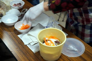 下準備として、学級長さんが1週間ほど前から塩漬けにしておいてくれたブリを薄く切り、人参の千切りと柚子の千切りを用意しました。