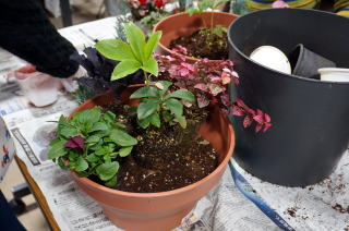 プランターに見栄えよく植物を並べ、土を入れていきます。