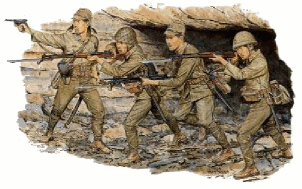 太平洋戦争で日米両軍の間で激戦が繰り広げられた硫黄島の戦い。その日本軍守備隊の兵士を1/35スケールで再現したプラスチックモデル組み立てキットです。 有名な星条旗を掲げるアメリカ兵の写真をはじめ、日米の映画も製作されて壮絶な 戦いの詳細が伝えられるようになった硫黄島の戦い。航空基地などがおかれ、絶対防空権 として設定していた日本軍と日本本土空襲にあたって確保したいアメリカ軍が激突。 栗原大将に率いられた日本軍守備隊は入念な準備でアメリカ軍を迎え撃ち、1945年2月19日 から3月26日にかけて、1ヶ月以上にわたって見事な戦いを展開したのです。 モデルはこの激戦の硫黄島でアメリカ軍を相手に奮闘を続けた日本軍守備隊の兵士をモデル化 した4体セットです。4体はアメリカ軍を相手に果敢に攻撃する躍動感あふれるポーズで再現。 軍刀を抜いて左手に持ち、右手には南部ピストルを構える士官に、それぞれ銃を構えて突撃 するポーズの兵士3体の計4体です。兵士が手にするのは三八式歩兵銃と一人は九六式軽機関銃。 どれも先端には銃剣を装備した状態でモデル化されています。服装は防暑被服を着用して、 足元は軍靴にゲートルを巻いた状態を再現。また、2体は頭部に略帽を被り、2体は鉄帽を被った 状態でモデル化。鉄帽は偽装網付きと布カバー付を再現しています。服の皺やベルトや サスペンダーなどのディテール、さらに、飯盒や水筒をはじめとする装備品の数々が 仕上がりの実感を高めます。 士官の手は右手は南部ピストル、左手は軍刀の柄の部分を一体で再現し、握り締めた状態を リアルに表現しています。 |
