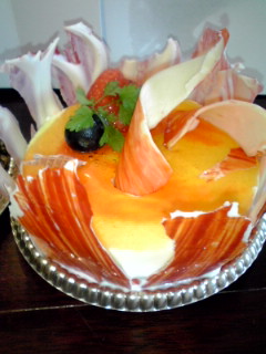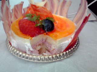 真田のケーキの土台はさわやかなイチゴのムースでした。 まわりに飾られていた赤い部分はホワイトチョコだったんですが、このチョコレートもかなり美味しくて、ナンジャのデザートに使われているチョコレートとは明らかに品質が違ってましたね。 御飯代わりに朝っぱらからこのケーキを食べたんですけど、難なく食べきることが出来ました。酸味と甘味がすごく調和していて、政宗さまのチョコケーキとはまた違った美味しさでございましたわ。 |