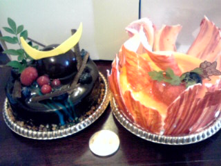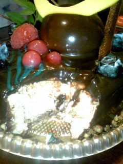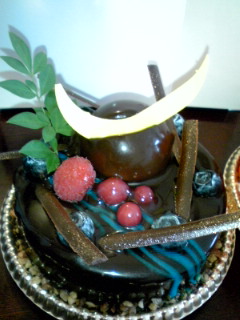 ちょっと光ってわかり辛いかもしれませんが、政宗さまのケーキの土台はほんのりブルーベリーの味がするチョコレートムースでした。コーティングされているチョコもまろやかで、結構甘いはずなのにパクパクいけちゃいました。丸く盛り上がっている政宗さまの兜部分はクリームの塊でした。 めっちゃ美味しかったです!! |