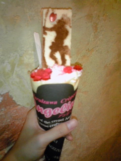 「真田バーガー」で昼食を済ませた後、次はデザートですね。 ナンジャタウンの二階に移動したところ、アイスクリームゾーンもケーキゾーンも全然混んでいませんでした。甘い物ならどれでもよかったのですが、もし混んでいる時だったら一番時間が掛かりそうなものを空いている今のうちにゲットしておこうと思いました。 そこで、銀魂の時は長蛇の列になってたり売り切れになったりもしたというクレープをチョイスです。 |