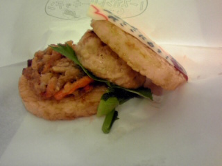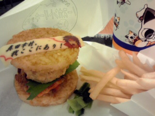 | 第二期10話「復活の若き虎! 改造大要塞・日輪の脅威、東へ!!」より 『真田幸村バーガー 』 ノースカントリーキッチン(ハンバーガー)900円 きんぴらのてんぷらと、つくね、野沢菜、大葉をサンドしたライスバーガー。真田幸村がプリントされたチーズをトッピングしました。ポテト・ドリンク付きです。 思っていたよりも小ぶりでしたが(モスのライスバーガーよりも一回り小さい)、ご飯だしポテトも付いてるし、これだけで結構お腹がふくれてしまいました。 美味しかったですけど、中身がすぐに分裂するのでものすごく食べ辛かったですわ(^^;)。 ←既に中身の野菜が一部こぼれ出ちゃってますし(笑)。 |