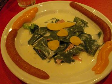 第一期13話「瀬戸内の激突! 火を噴く海の大要塞・富嶽!!」より 『毛利の日輪パスタ』 イタリアントマト(ナンジャタウン内)1,000円 ホウレンソウの生パスタと、チーズで毛利家の家紋を表現。ソーセージとチーズソースで、毛利元就の輪刀を表現しました。 ![]() クリームソースの上に平べったい緑色のパスタが盛りつけられているんですが、見本の写真よりもボリュームがなかったです。 なので、わりと楽に食べきることが出来たので、数を多く食べたいと思っている分にはありがたいメニューでしたね。 でも、一品でお腹いっぱいにしたい人には全然物足りないと思いますが(^^;)。 私はクリームソースやチーズが大好きなので、好きな味だったから美味しかったです。 |