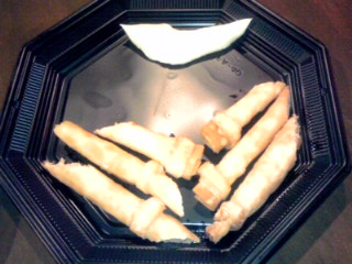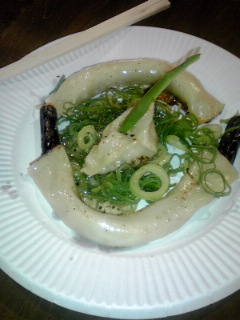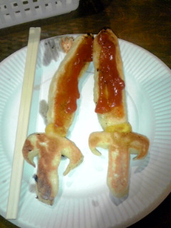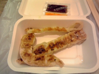 お夜食その1。 第二期9話「竜と鬼 尾張の激突! 爆走!伊達・長曾我部連合軍!!」より 『元親の碇槍餃子』 三よ志(池袋餃子スタジアム) 580円 長曾我部元親の碇槍を焼き餃子で表現したメニューです。 お店のお兄さんに持ち帰り出来るかと聞きましたら、ちょっと盛り付けが変ってもいいなら持ち帰り出来ますよ〜との事だったので、 お夜食として買って帰りました。 普通に焼き餃子。普通に美味しかったです。 |