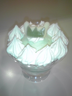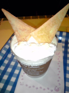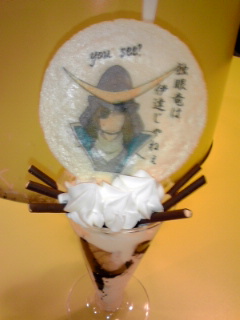 天守閣カレーを何とか完食したは良いものの、あまりの満腹感にしばらく動けず、通路に置かれたベンチに座ってしばし休憩をとりました。その日まだ一品目なのに先が思いやられますな(^^;)。 しかし、甘いものは別腹と言う事で、しばらく休んでからアイスクリームを食べに行きました。 デザートには『独眼竜和風パフェ』をチョイスです。 |