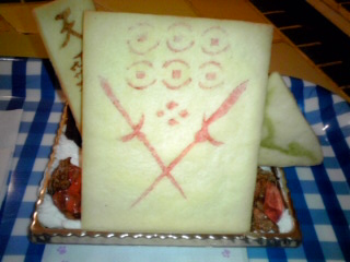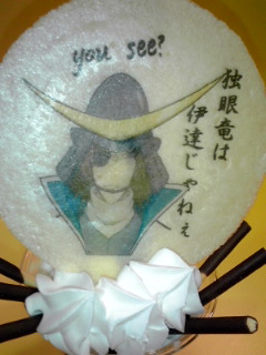 政宗さまがプリントされているおせんべいは、駄菓子屋なんかで『ミルクせんべい』とか『花丸せんべい』ってネーミングで売られている、ジャムとか練り飴とかを塗って食べる薄くてふわふわなおせんべいですね。食べるのが勿体ないですけどとって置く訳にはまいりませんからねえ。 真っ先におせんべいをバリバリ頭から食べちゃいましたけどね(笑)。 |