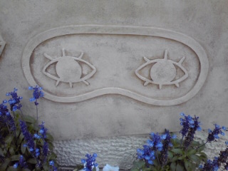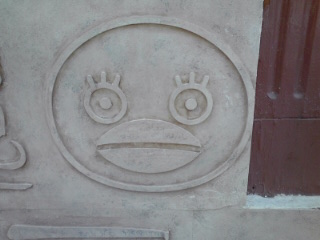 そして、ジャンプショップの外壁には象形文字みたいな模様が彫られているんですけど、その中にエリザベス発見!! 愛らしい〜(*^_^*)。 沖田くんのアイマスクもありましたヨ。 他にはナルトのマークとかありましたけど、エリザベスが一番目立ってたような気がしましたわ。 |
