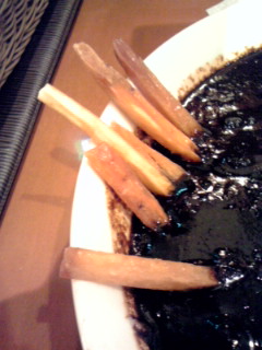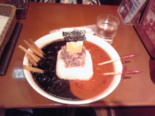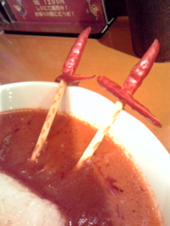 想像以上のボリュームに少々戸惑いながらも、まずは赤マサラと黒マサラのカレールーだけをスプーンですくって食べてみました。本格的なカレーなので美味しいは美味しいんですが……。赤いカレーが辛い…(@@;)!! 他の方のブログでも辛いと書かれていたのですが、本当に辛かったです。黒いカレーはそんなに辛くなくてコクがあってちょうどいい感じなんですが、赤カレーの辛さばかりが際立ってとにかく辛い(><;)!! これ幸村ちがう、辛村や(と、思わず泣きごとメールをASIAさんに送ってしまいました:笑)。 自分は辛いものがそんなに得意ではない所為もあると思うんですが、天守閣カレーはかなり辛いと思いました。辛さに対する注意書きとか辛さのレベルもメニューには表示されていなかったんですが、これって子供にはちょっと無理なんじゃないかしら…。鷹の爪の真田の槍も、もしも子供がパクッといっちゃったりしたら超危険だと思うんですけど……(^^;)。 このボリュームだけでも難攻不落チックでしたが、辛村カレーにはホント難儀してしまいましたヨ。でも何とか完食いたしました。しんどかったー。そして最初は『ええ〜、カレーに芋けんぴぃ?? ミスマッチもいいとこじゃん、もっと考えてよ!!』と憤慨していたんですが、辛村カレー食べた後の芋けんぴの甘味はまるでオアシスの如く感じられました(笑)。いいね、カレーに芋けんぴ! まさかメニュー開発者はここまで読んでカレーに芋けんぴをチョイスしたのかしら。だとしたら凄いな(笑)。 |