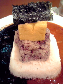 | 第一期12話「安土城天守 明日を懸けた死闘!!」より 『安土城天守閣カレー』 ナジャヴ倶楽部(ナンジャタウン内)1,400円 白米とゆかりご飯、玉子焼き、のりで安土城天守を築き上げました。左は伊達政宗をイメージした黒マサラカレーに芋けんぴで六爪をトッピング。右は真田幸村をイメージした赤マサラカレーと、鷹の爪で作った二槍を添えました。 お料理が運ばれてきてまず思ったのは、『何かコレ量がめちゃ多い…』でございました(^^;)。恐らく銀魂の時に食べたエリザベスカレーと同じお皿だと思うのですが、エリザベスカレーの時よりもなみなみとルーが注がれてます。 ご飯は一見小ぶりな感じですが、エリザベスカレーの時と同様に崩れないように結構みっしり可っ詰まっています。ゆかりご飯の部分だけでおにぎり一個分くらいはありそうですし、想像以上のボリュームでした(^^;)。 |