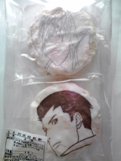 第二期12話「蒼紅決死戦! 激闘の果てに吹く風の音よ!!」より 『四武将煎餅』 繁昌なんでも本舗(駄菓子屋) 630円 キャラクタープリント入りの砂糖煎餅4枚(伊達政宗・真田幸村・徳川家康・石田三成)セットです。 もはやコラボイベントでは定番となっているプリント入りのおせんべい。 食べちゃえば一緒なんですけど、ついつい絵柄のきれいな奴を選んでしまいますよね〜(笑)。 |