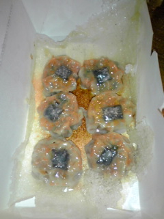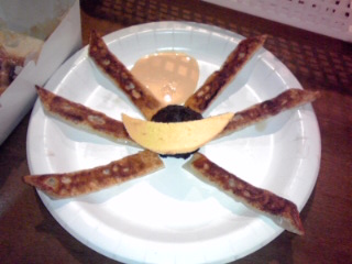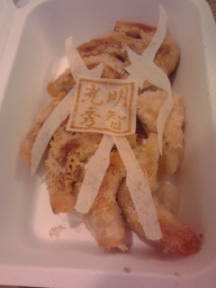 第二期1話 「乱世再び! 裂界武帝・豊臣秀吉降臨! 」より 『真田幸村餃子』 赤坂ちびすけ(池袋餃子スタジアム) 550円 一口餃子を使って六文銭を、海苔で六文銭の空洞を表現。野沢菜と豚肉を使ったオリジナル餡を使用しています。 「銀魂」の時には高杉の着物の蝶著柄をモチーフにした餃子を売っていたお店ですね。高杉の時はホント見た目ばかりで全然ボリュームがなかったんですが、今回の六文銭モチーフ餃子はちゃんと中身が入っていて美味しかったですね。味もしっかりしていましたし。タレをつけなくても十分味が濃くてくどいくらいだったかも。 最初に食べた皮ばっかり揚げ餃子(笑)と比べるとホントちゃんとしてて美味しかったです。 |