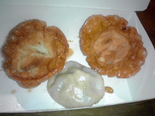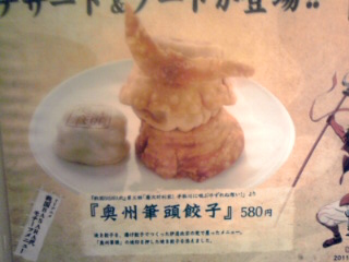 かるくアイスを食べた後は餃子ですヨ。 まずはこちらの餃子にチャレンジしました。 第二期3話「慶次対利家! 手取川に咽ぶゆずれぬ想い!」より 『奥州筆頭餃子』 華興(池袋餃子スタジアム) 580円 揚げ餃子でつくった伊達政宗の兜で、 焼き餃子を覆ったメニュー。 「奥州筆頭」の焼印を押した焼き餃子を添えました。 この餃子の見本の写真はこちらです→ でも実際はこうです(笑)↓ |
