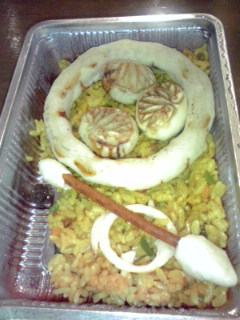 第一期6話「裂かれた絆 政宗屈辱の退却!」より 『家康餃子』 来らっせ(池袋餃子スタジアム) 680円 徳川家康の衣装をイメージした黄色のドライカレーの上に、 徳川家の家紋を模した餃子をのせ、武器を添えました。 チラシには持ち帰り不可となっていたんですが、お店の人にテイクアウト出来るかどうかお尋ねしましたらOKとの事で左記のようなパック詰めにしていただきました。 食べる時にパックのふたを開けてまず目に飛び込んできたのはレーズンでした。干しブドウってそんなに好きな食材ではないうえに、あまりドライカレーに入っているイメージもなかったので、『ええっ、レーズン入りのドライカレーってマジでか(@@;)?!』ってちょっとビビッてしまったんですが、特にレーズンの味が際立ったり喧嘩する事も無く美味しかったです。 餃子はちょっと皮が粉っぽかったですが、美味しかったです。 上記の皮ばっかり揚げ餃子(笑)と一緒に食べたせいもありますが、この値段でこのボリュームなら納得です。徳川の家紋もきれいでしたし、頑張ったで賞をあげたいメニューでした。 |