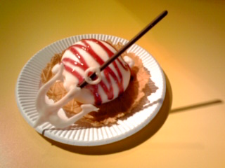 そんな訳で一時間ほど時間をつぶしてからナンジャタウンに行きまして、最初に食べたのがこちらでございました。 第二期4話「安土城の亡霊!? 幸村を襲う嘆きと魔の咆哮!」より 『長曾我部アイス』 オリエンタルの青い月(アイスクリームシティ) 480円 トルコの伸びるアイスドンドルマにブルーベリーソースをかけて長曾我部元親をイメージし、 チョコレートとお菓子でつくった碇槍を添えました。 普通にアイス。普通に美味しかったです。 つか、前日前々日とお客が少ない時この店の店員さんも店頭にいない時が多くて困ってたんですよね(笑)。この時ホントはまだアイス系を食べるつもりはなかったんですが、たまたま通り掛かった時に珍しく店員さんがちゃんといたので急きょ食べる事にしました。 |