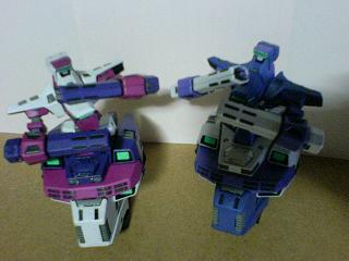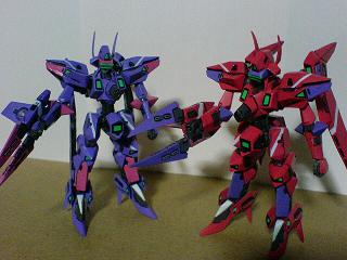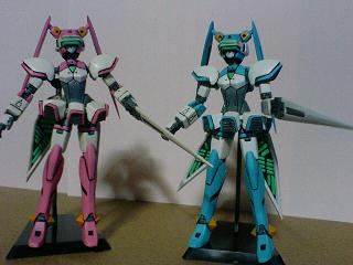 | 私が使用してボッコボコにされたVRその1、フェイイェン嬢です。左のピンクが1Pカラーで、右のブルーが2Pカラーです。どっちの色も可愛いですねえ。外見だけでなく、高速でタカタカ走る姿も可愛くて大好きでした。スタート時のちょっとしなをつけた立ち方とか、何気ない仕草が非常に女の子らしい機体でございます(製作者はポーズなどにかなりこだわったらしいです)。でも、オラタンのナイトまではかっこいいと思えたんですが、マーズとかのメイド姿には正直ついていけてません(笑)。ちなみに写真には写ってませんが、ハイパーモードなフェイイェン(シークレット)もちゃんと持ってます。 ご覧の通り、耐久度はかなり低めなので何度ライデンのビーム直撃でハイパーモードになる間もなく瞬殺されたかわかりません(笑)。 |