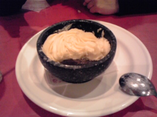 ←大きさはこんな感じ。ミニマヨネーズ付です。十分濃い味付けなのでマヨネーズはつぎ足しませんでしたけどね(笑)。追加マヨ、使う人いるのかなー。 一人前とは言え、上部に敷き詰められているマヨネーズ味のマッシュポテトの下にはハンバーグが置かれていて、さらにその下にはリゾットがぎっしり詰まっているので結構なボリュームでした。イタリアントマトでは一人ワンオーダーが必要だったのですが一人にマヨ丼一個だと多過ぎるので、ドリンク+マヨ丼をオーダーして二人で半分こして食べました。半分こしてちょうどいい量でしたね。最初のフードと言う事でお腹の具合的にも美味しくいただく事が出来ましたわ(^−^)b。 |