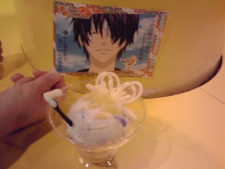 お次は『高杉晋助の紅芋マロン』!! マイナス30℃の鉄板の上で紅いも栗マジックアイスをつくり、チョコでできたキセルと蝶を飾り高杉をイメージしたアイスを作成しました。 去年の時は凄い行列に並ぶ気になれずに高杉のアイスをパスしたので、今回は楽々食べる事が出来たのでよかったです。 私がアイスの写真を撮ろうとしたら椎さんが「高杉忘れてるよ〜」と、横からおまけをかざしてフレームインしてくださいました(笑)。 ![]() アイスはその名の通りおイモと栗味でした(笑)。 色味的には高杉っぽいけど、もっさりしたイモ栗味は高杉っぽくないよね〜と感想を述べましたら、椎さんに『じゃあ高杉っぽい味って何味?』って突っ込まれてしまいました(^^;)。 確かに高杉っぽい味っていったい何味になるだろうか。 ちょっと思い浮かびませんでしたわ(笑)。 |