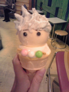 更に『天然パーマの銀さん2』!! 伸び〜るトルコアイスの銀さん。顔はチャイアイス、天然パーマはミルクと黒ゴマのミックスアイスで出来ています。ラムネとお菓子で出来た、銀さんの好きな団子を乗せました。 去年は銀さんのこのアイスも食べられなかったので、今回食べる事が出来て嬉しかったです(*^_^*)。 ![]() 銀さんの髪型を作るのに結構時間が掛かる所為か、溶け始めるのが早かったです…(^^;)。アイスの職人さん(?)が一生懸命銀さんの髪の毛をツンツン立たせるんですが、混んでる時は作るの大変そうですよね。 だんごの飾りはラムネでした。ラムネの固さは柔らかいアイスとはちょっとミスマッチだと思いました。 そしてアイスは美味しかったんですけど、コーン部分は湿気っているのか残念なくらい美味しくなかったです(><;)。 |