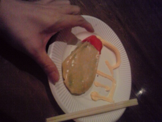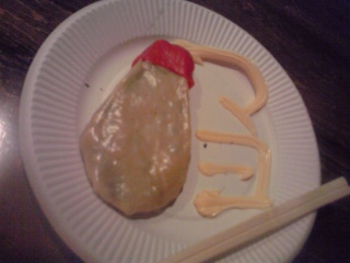 『帰って来たマヨネーズが足りないんだけどォォォ!!餃子』 ツナマヨ味の餡を入れたマヨネーズケースそのまんま餃子。赤いキャップはもみじおろしを練り込んだ皮で出来ています。仕上げに“マヨ”とマヨネーズで描きました。 ![]() 去年バージョンと比べると中身のマヨ風味が随分と控えめになったような気がしました。 |