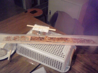 椎さんが一体どの餃子をチョイスするのかとても興味がありまして、ちょっとわくわくしながら席を確保して待っていたんですね。 そしてそんな私の元に現れた椎さんの手に持たれていたのは、フードの中でもっとも大きいと思われる『超長いんだけどォォォォ!銀さん木刀餃子』でした(@@;)! 最初に食べたマヨ丼とザキのクレープでお腹いっぱいになったと言っていた椎さんが一番選ばなさそうだと思っていた餃子だったので超ビックリですヨ。しかも椎さん小柄だから尚更木刀餃子が大きく見えました(笑)。 |