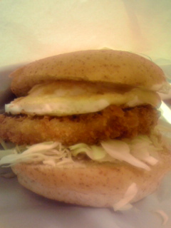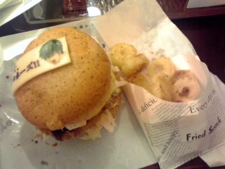 まずは『土方スペシャルバーガー』です。 トンカツとキャベツ、たまごを挟んだバーガーに、たっぷりのマヨネーズをかけて作った、スペシャルバーガー。ドリンク、ポテトつき。 ![]() ドリンクはウーロン茶で固定されていたのですが、付け合わせのポテトは「おこげ」(ってネーミングだったかな?超うろ覚え:笑)に変更出来ると言われたので、ポテトよりもヘルシーかもしれないと思ったのと物珍しさから「おこげ」に変えていただきました。でも正直「おこげ」にしたのは失敗でしたー(><;)。 きりたんぽを輪切りにしたような物を油で揚げてあるので、カロリー的にはポテトと全く変わらないと思われます。そして想像以上に固かった…!! ファーストフードの付け合わせという感じではなく、ちょっと固めの揚げかき餅って感じでした。冒険せずに素直にポテトにしておけばよかったと後悔した一品でございます(笑)。 |