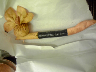 『高杉のキセル餃子』 高杉のキセルを再現した豚肉餡の揚げ餃子。パリパリに揚げ た餃子の皮の美しい蝶がキセルの周りを舞っています。 ![]() 飾り部分が違うだけで、去年のキセル餃子とほぼ同じでしょうか。 飾りの蝶は餃子の皮だけを揚げただけのものなので、あまり美味しくなかったですね。皮だけだと脂っこい(><;)。 |