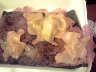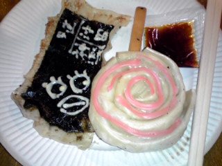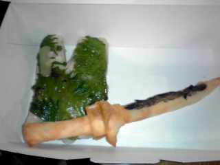 『銀八先生のレロレロキャンディー餃子』 銀八先生のペロペロキャンディー型に作った鶏肉餡の渦巻き 餃子と、黒板を表現したのり餃子のセット。 ![]() 「のり餃子」とは名ばかりで、餃子の皮に海苔を乗せただけの代物です。正直美味しくなかった(^^;)。キャンディー部分は中身が結構ミッチリ詰まっていたので、見た目以上にボリュームがありました。 |