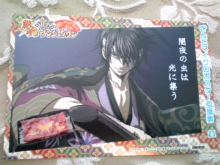 『高杉の「闇夜の蝶」餃子』 ![]() 餃子は残念な感じでしたが、このおまけの高杉さんはカッコイイですね。でも、ジャスタウェイ倒しの景品にも全く同じ絵柄の物があったような気が…。せっかくなら別の絵柄にして欲しかったという高杉さんファンが多かったんじゃないでしょうかねえ。 |