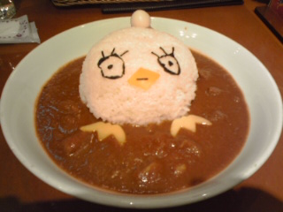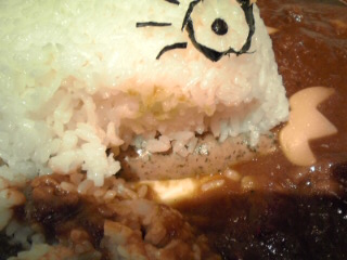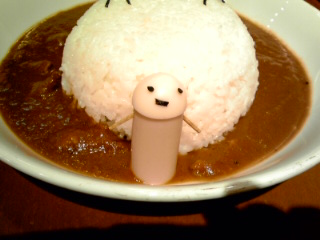 『帰って来たエリザベスカレー』 ![]() のりとチーズで作ったエリザベスカレー。中には「おっさんの足」に 見立てた二つのソーセージが入り、うずらの卵と魚肉ソーセージ で出来た小さなジャスタウェイが背中に寄り添います。 |