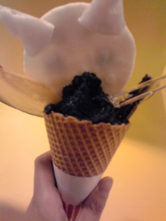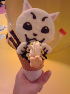 『土方までも噛んじゃうの?』 ![]() 絶品の黒いジェラート「ネッロ」に、せんべいで出来たマヨネーズやマシュマロ・チョコを飾りつけ、土方を噛んでいる巨大定春をアイスの上で再現しました。 |