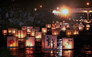 第57回金沢百万石まつりの特別協賛行事「第34回加賀友禅燈ろう流し」が6日夜、金沢市内を流れる浅野川の天神橋−浅野川大橋間であり、1500個が川面を赤く照らした。