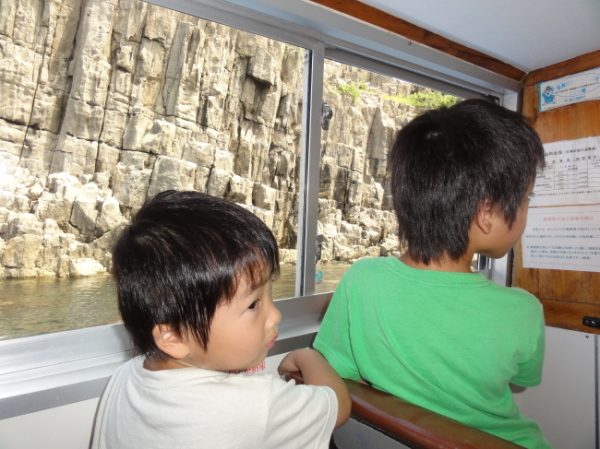 | 福井県の東尋坊へ 初めての遊覧船に乗り出発を待つ二人 |