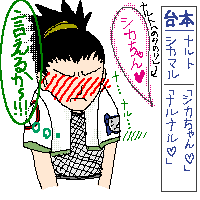 ↑ということで、シカマル。 ナルト「シカちゃんvv」 シカマル「ナ…ナル…//////(い、言えるか〜!!めんどくせーことやらすなっての!オレのキャラじゃねーし!)」 ナルト「ん〜どうした〜?シカマル〜?台詞は〜?ナルナルvって言ってみ?」←すっごく面白がってからかってる。 |