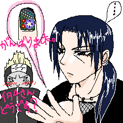 イタチ(マニキュア…組織の方針とは言え、面倒だな…)「鬼鮫、塗ってくれないか?」 鬼鮫「お安いごようですよ、イタチさん」←下僕。 ----塗り中---- 鬼鮫「どうです?イタチさんv」 イタチ(……ここまでやれとは言ってないんだが……) ↑両手全部ばっちりネイルアート(笑) |