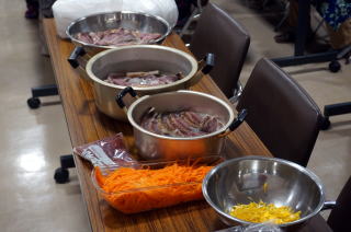 下準備として、学級長さんが1週間ほど前から塩漬けにしておいてくれたブリを薄く切り、人参の千切りと柚子の千切りを用意しました。