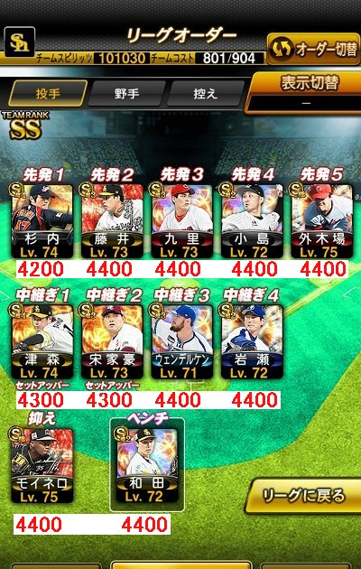 これが、将来のベストオーダーです。(ほぼ98%完成。) なお、選手の下に書いてある数字は、スピリットです。 (野手は「段違い」なので、作るの、大変でした。) |