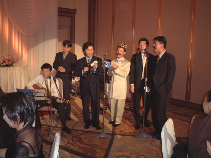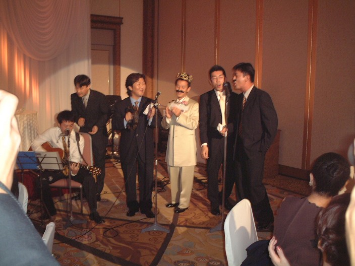 新郎友人達(坊さん衆)の歌の祝福での1シーン.曲はSMAPの”世界に一つだけの花”