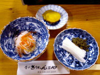 つきだしには、囲炉裏で燻されたたくあん「いぶりがっこ」 。スモーキーな香りと歯ごたえがたまら