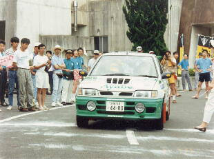 | AE101 レビンが発売されてまもなくのラリーで、この1台たけが車両変更して参加しました。JAF登録車両のNo.が発表されていませんでしたが、JT-115と言う事が確認でき、無事出走しました。 |