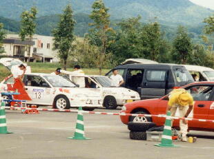 | 三笠市内に設けられたスタート、サービス、ゴール会場です。全日本選手権となるとサービスカーも多くなり、広い場所でも狭く感じられます。 |