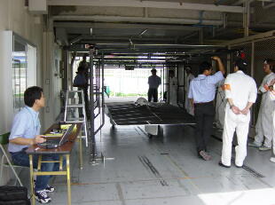 | 車両寸法、ソーラーパネル面積の測定はゲージの中でレーザポインタを用いて行われます。寸法は投影面積で規定されており、メジャーでは正確に測定できない為です。 |